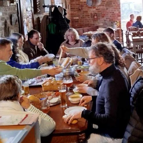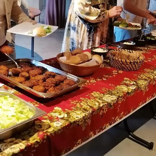 Baguette accompagnée d’un buffet de jambon, fromage jeune et préparé maison, complété par une soupe fraîche.