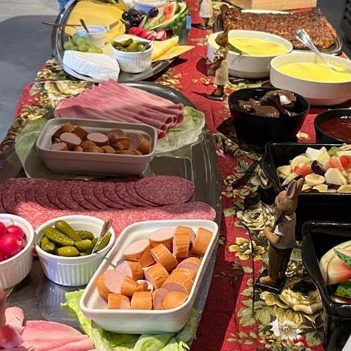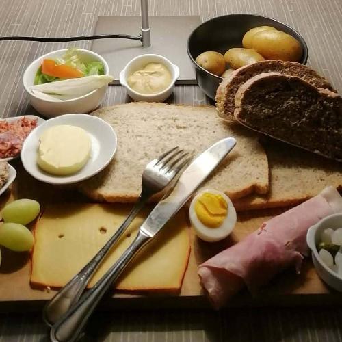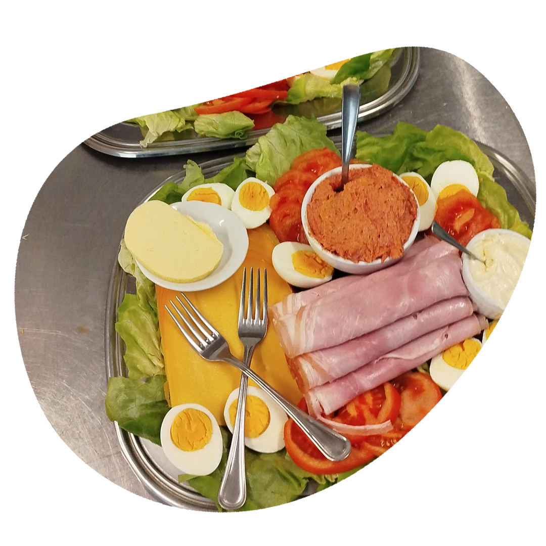Een assortiment brood met kaasschotel, fijne vleeswaren, verse groenten en fruit, een pastabereiding en huisgemaakt gebak of een dessert van de dag.